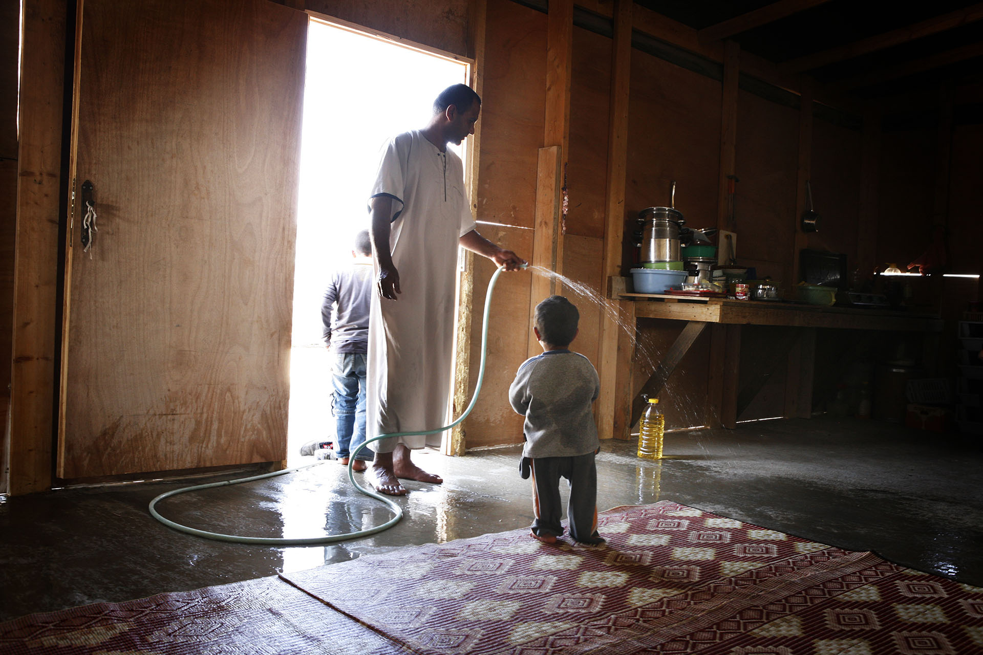 Azeez sprays water on the floor of the family home to cool it down. Al Araqib April 2009