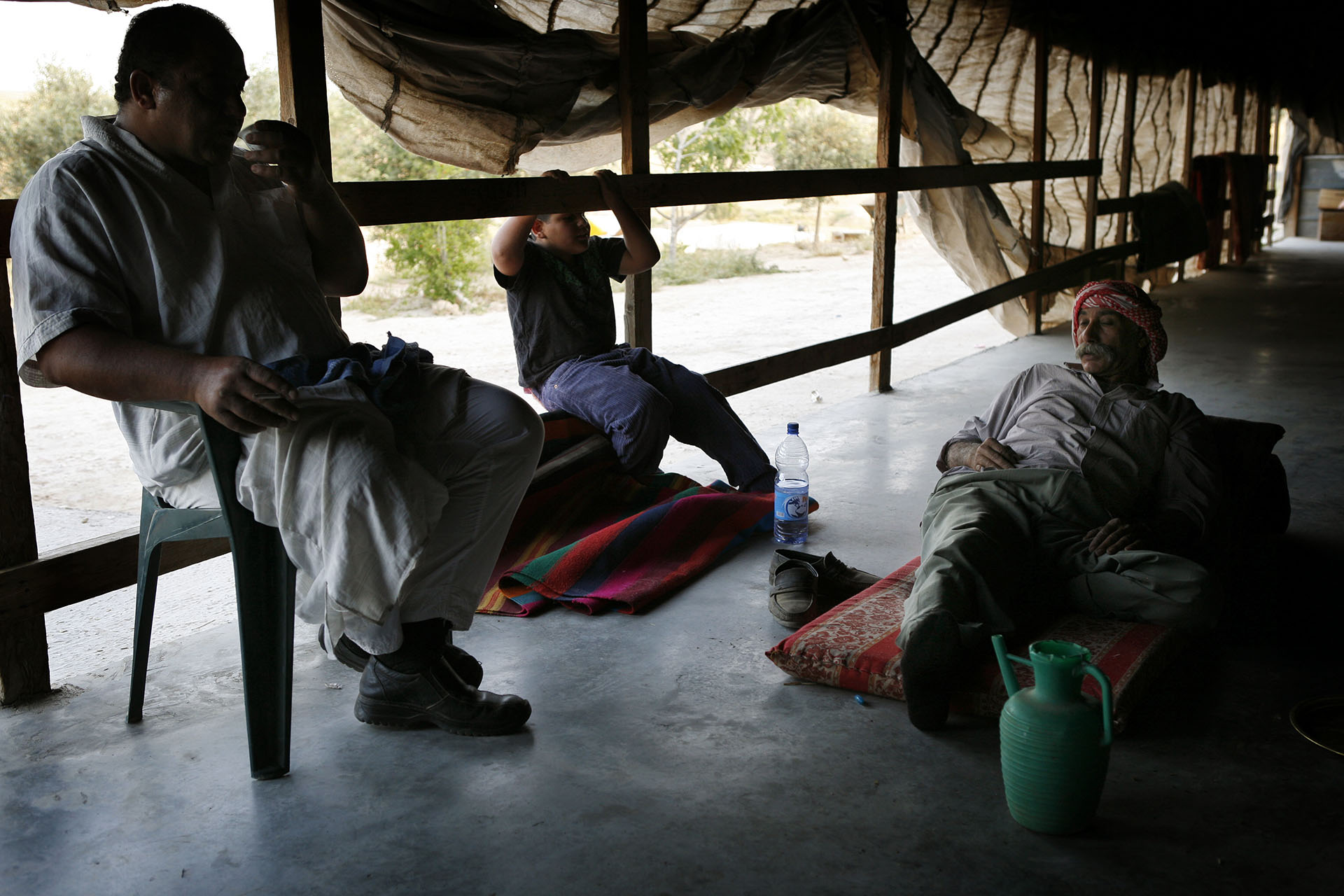 Sheikh Sayah lies on a mat in the Shig, the tent in which men meet, next to him Salim and Mohammed. Al Araqib, April 2009