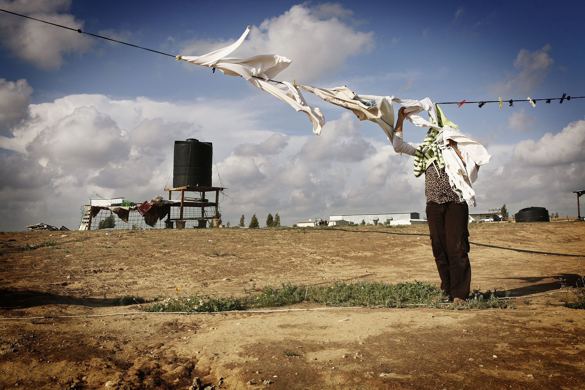 Fatima picks up the laundry, in the background the village. As an unrecognized village, Al Araqib is not connected to the water grid. Water is brought in by truck and stored in tanks connected to each home. Al Araqib, February 2010.