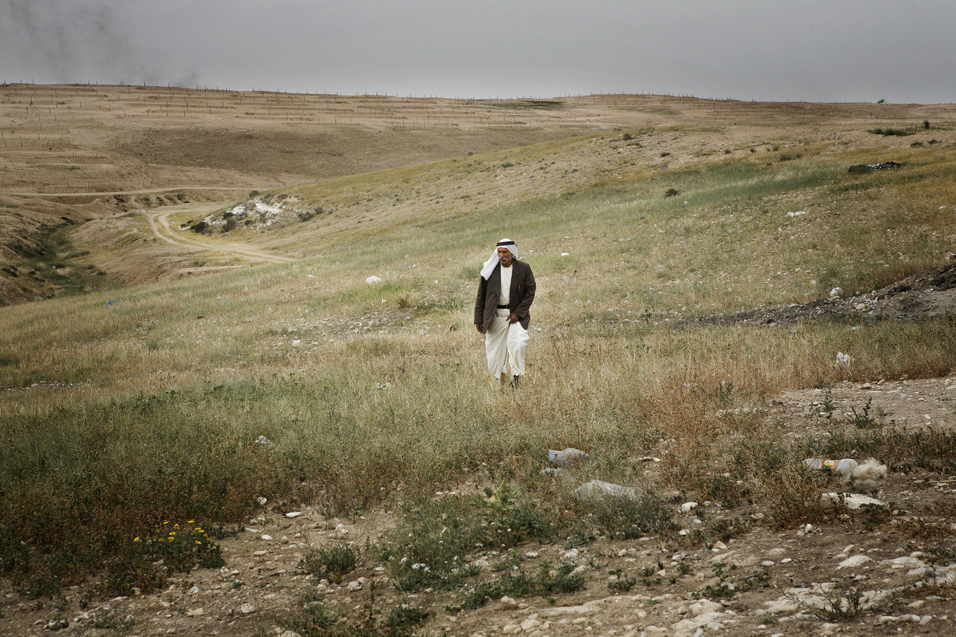 Sheikh Sayah Al Turi walks towards the village from the nearby wadi. In the background young trees planted by the Jewish National Fund (JNF) are visible. April 2009