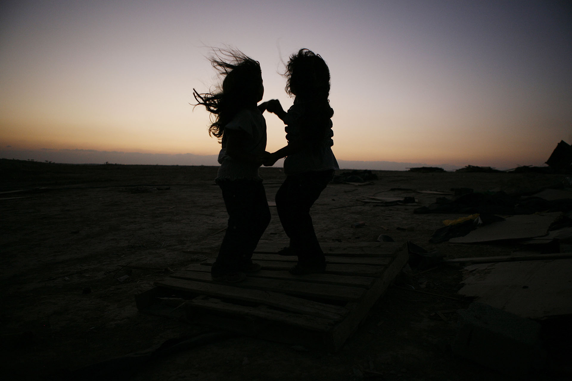 Said and Ibrahim play on the skeleton of an old car in Al Araqib, April 2009