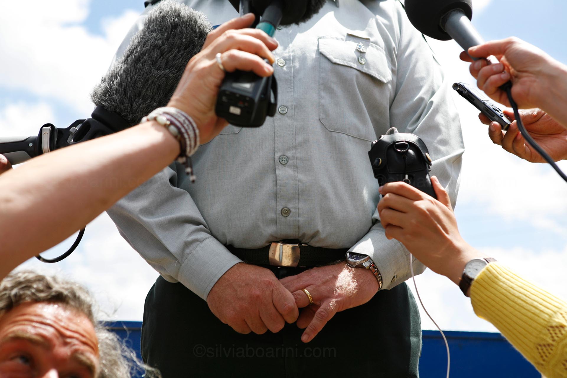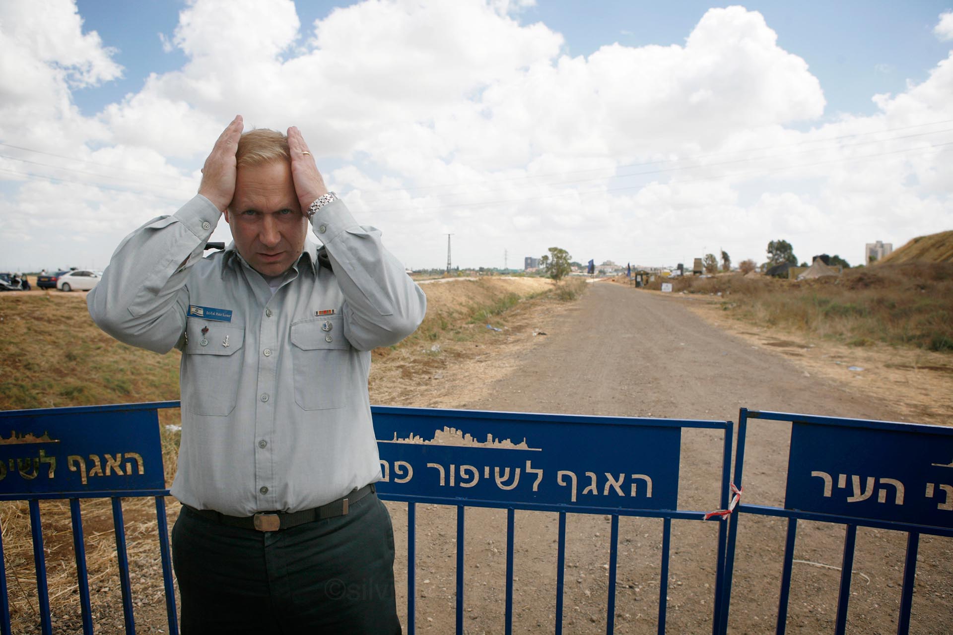 Israeli armed forces spokesperson Peter Lerner meets the press at an 'iron dome' tour. Israel, July 2014