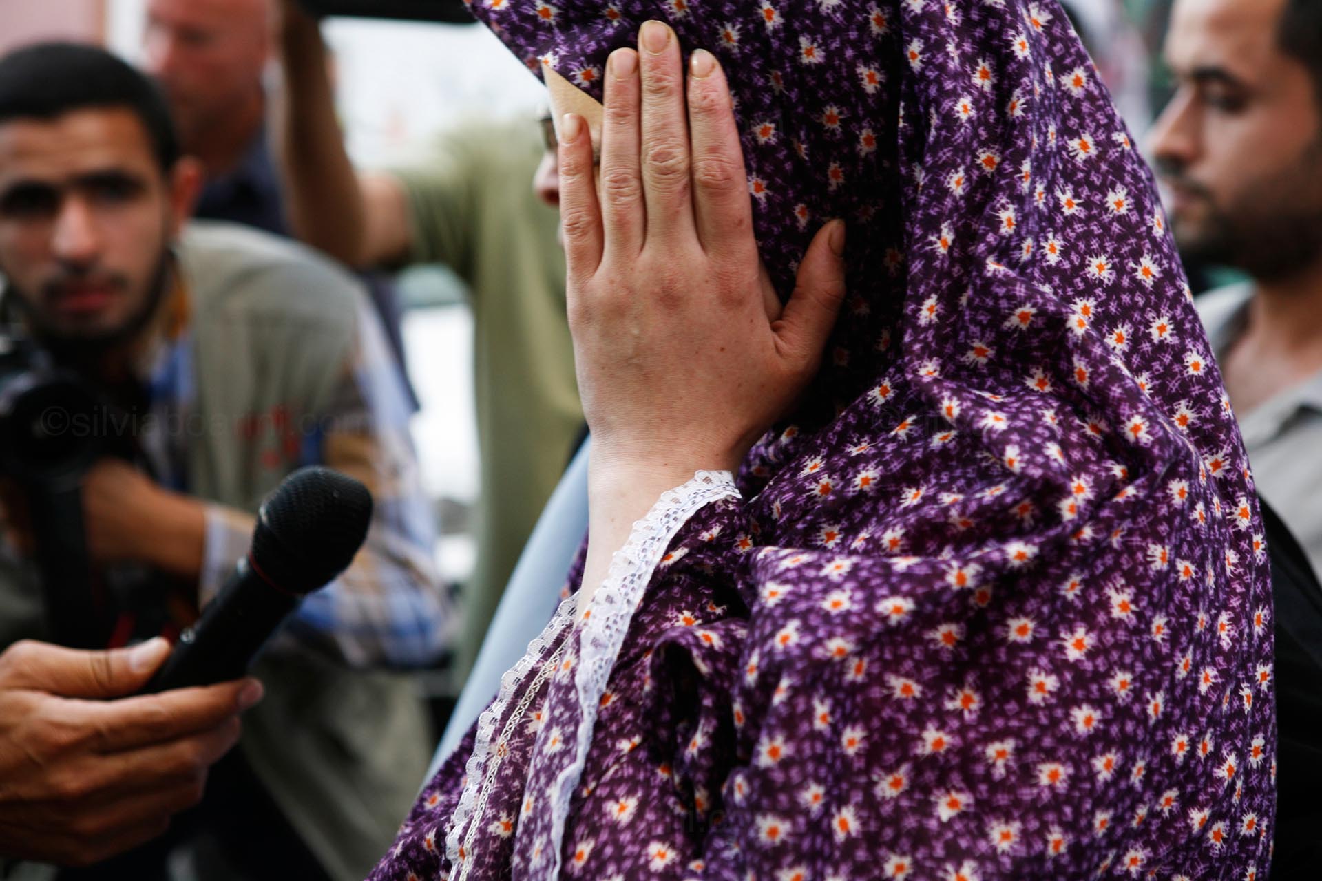 A woman raises her hands to her face in shock as the press approaches her after she exited the Shifa hospital morgue. Gaza, July 2014