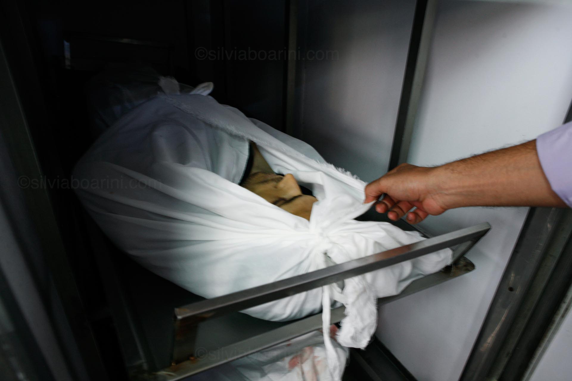 A doctor opens one of the morgue's units to show a young person brought in following shelling near Khan Younis. Khan Younis hospital, July 2014
