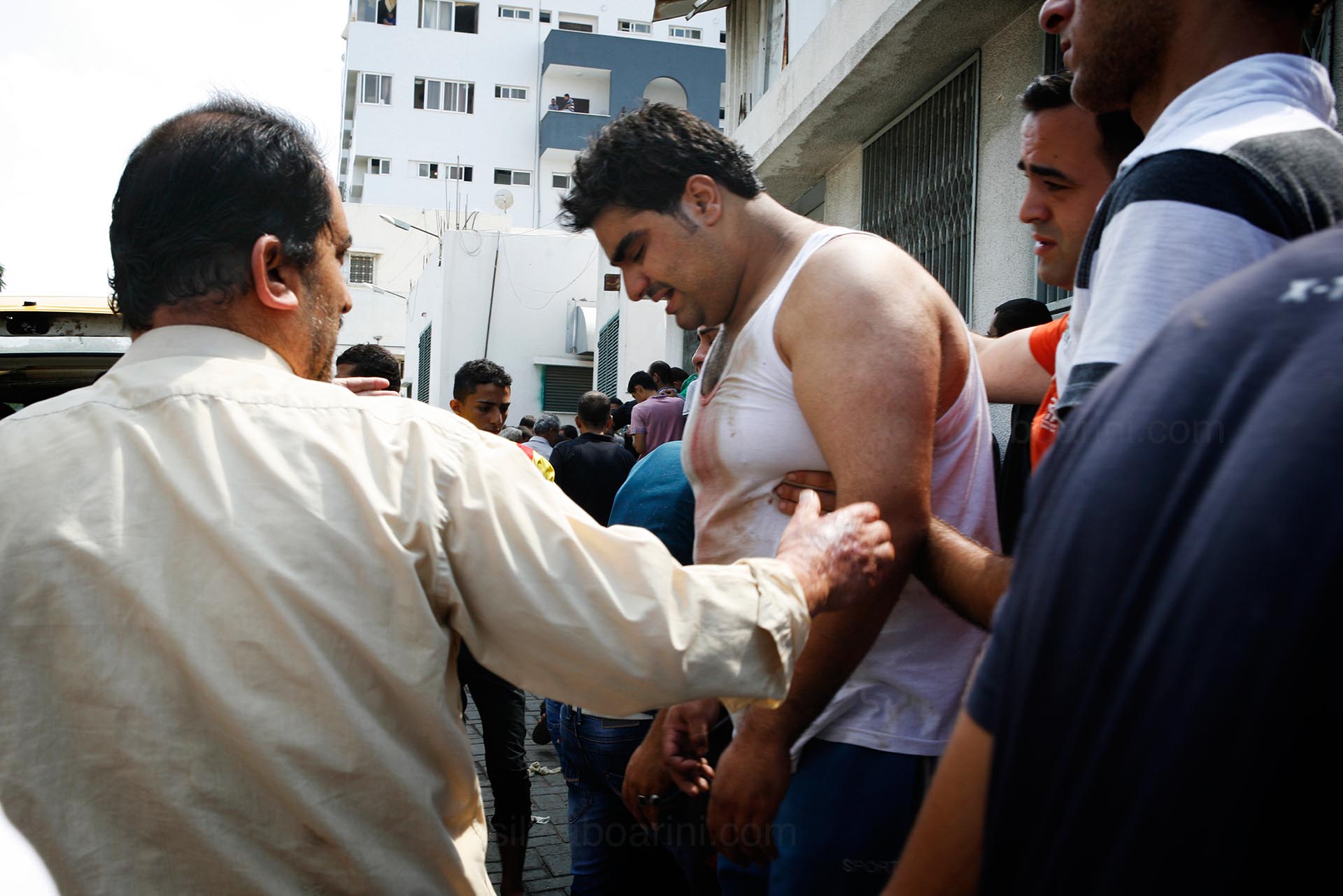 Distraught family members leave the morgue at Shifa hospital after viewing or bringing in their deceased relatives. Gaza, July 2014