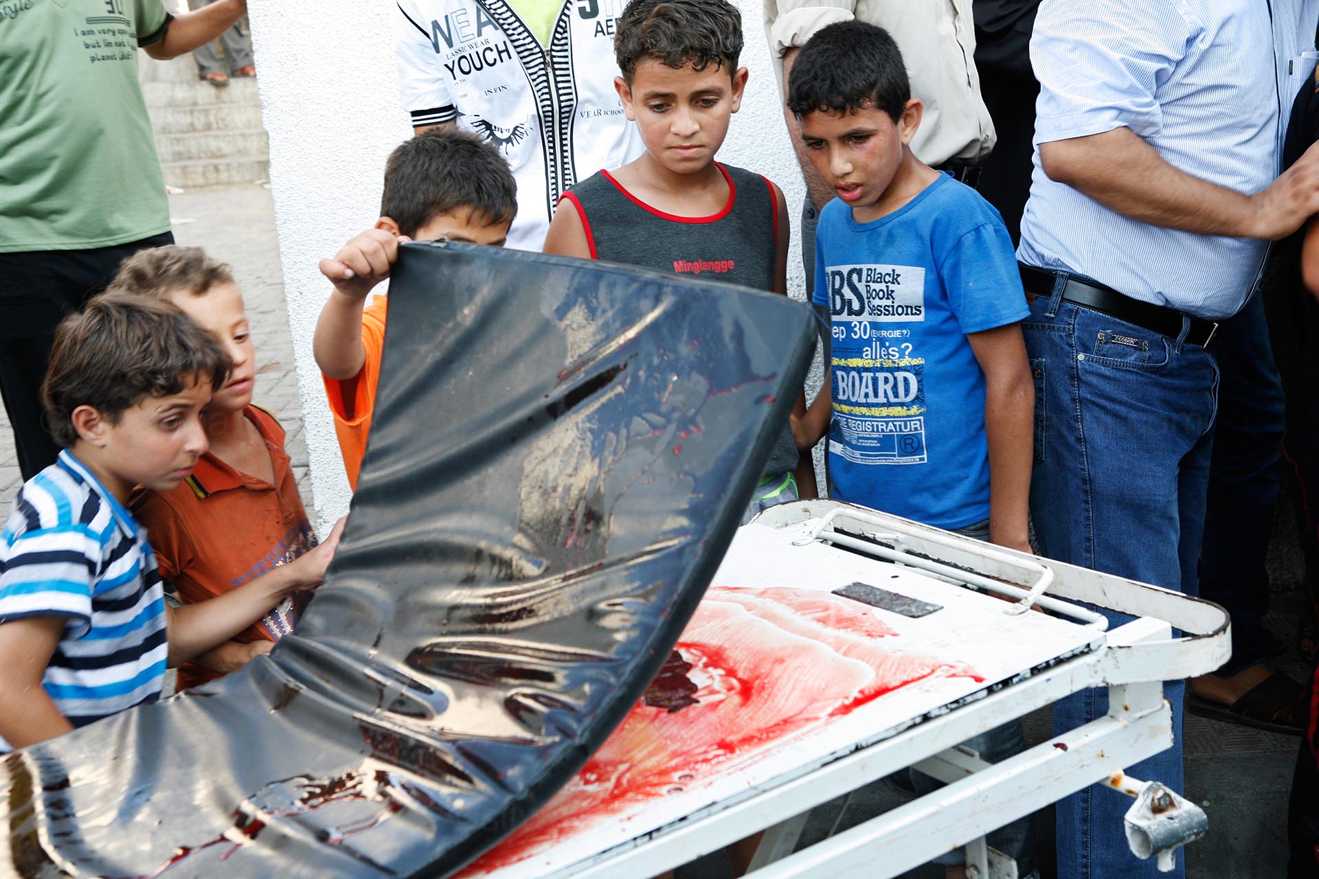 With a mix of curiosity, fear and disgust, children hanging outside the Shifa hospital survey the blood on a trolley that brought in a body. Gaza, July 2014