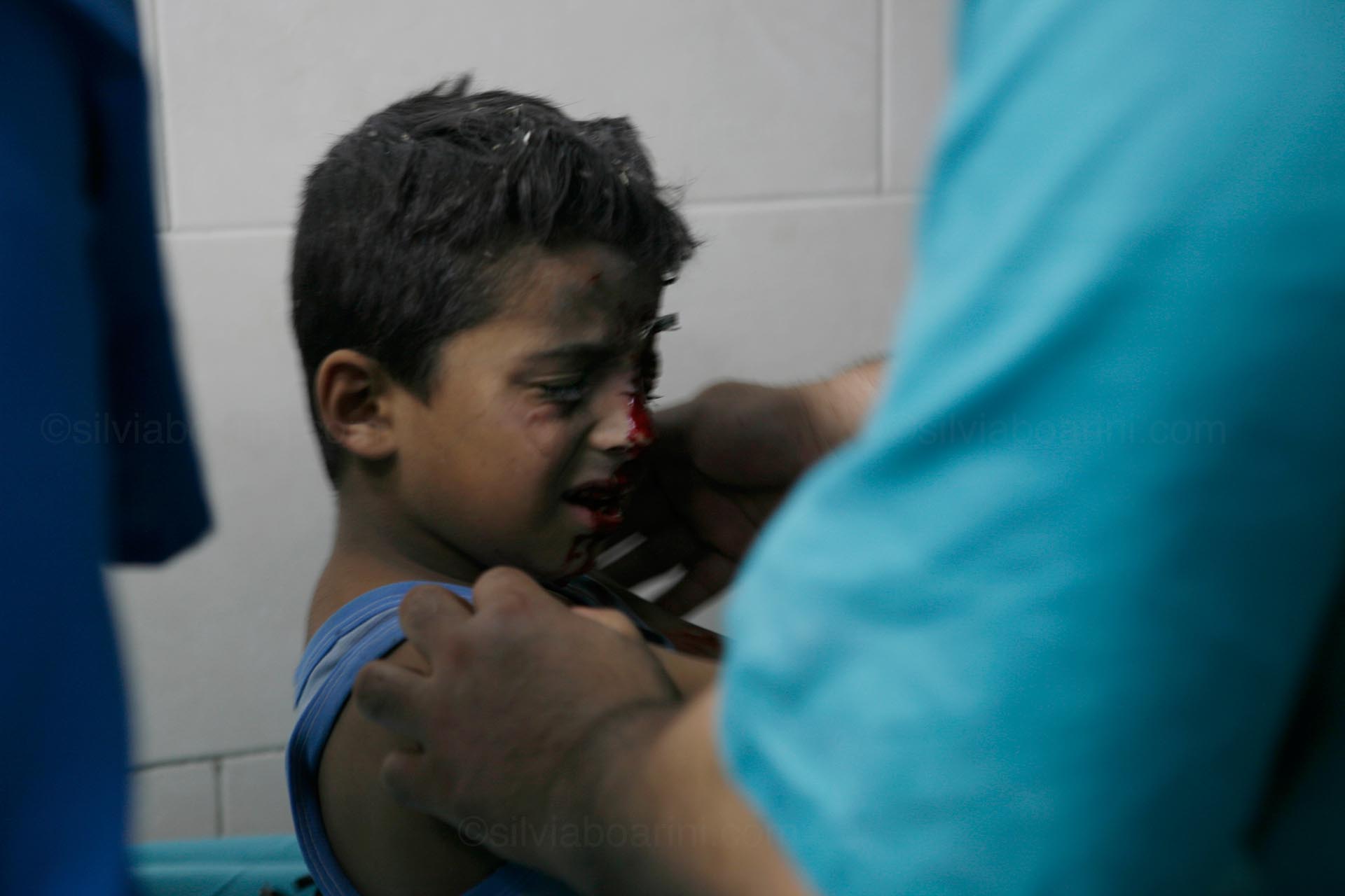 An injured child is brought in to Shifa hospital following Israeli shelling. Gaza, July 2014