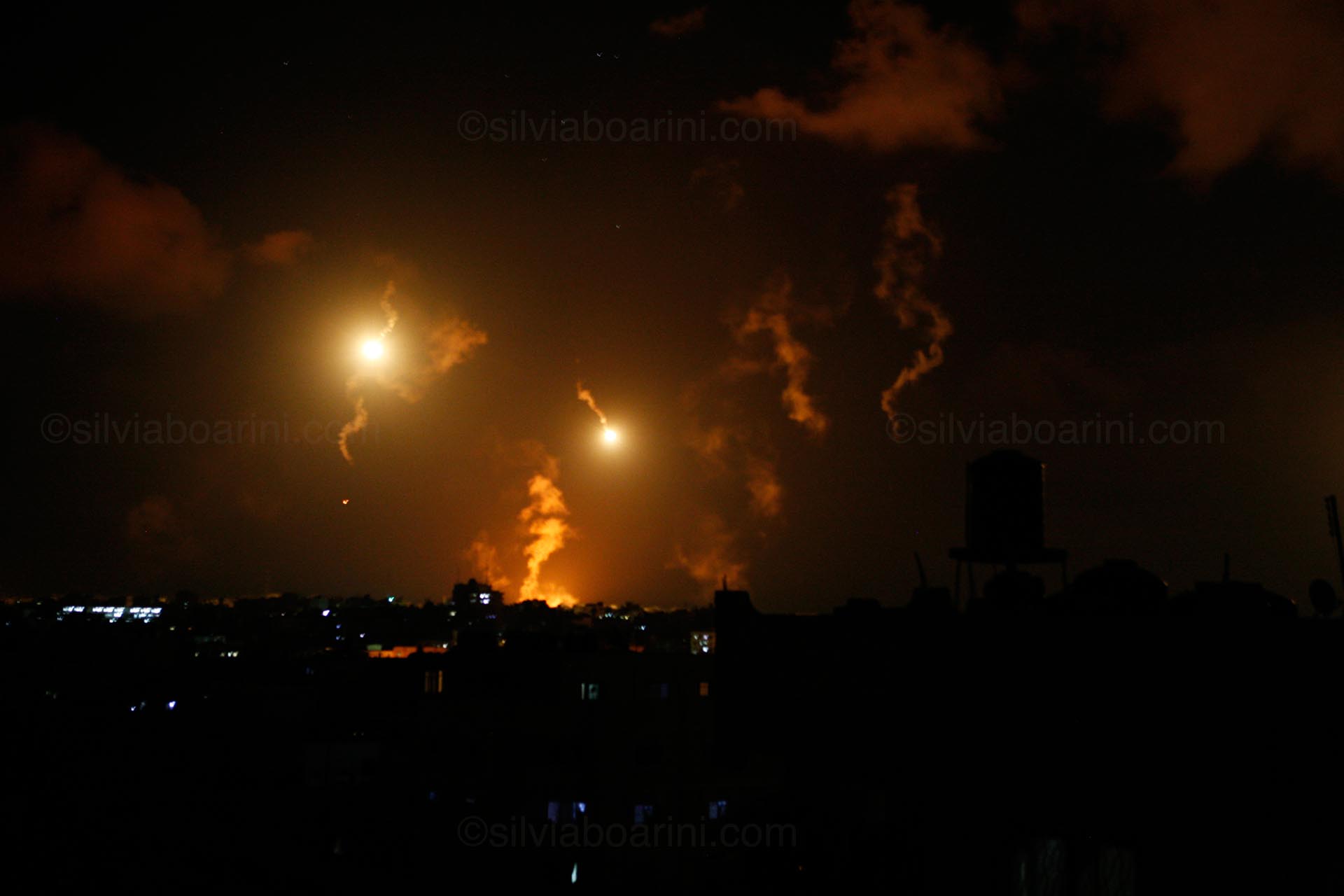 Flares light up the night sky in Shujayea. Gaza July 2014