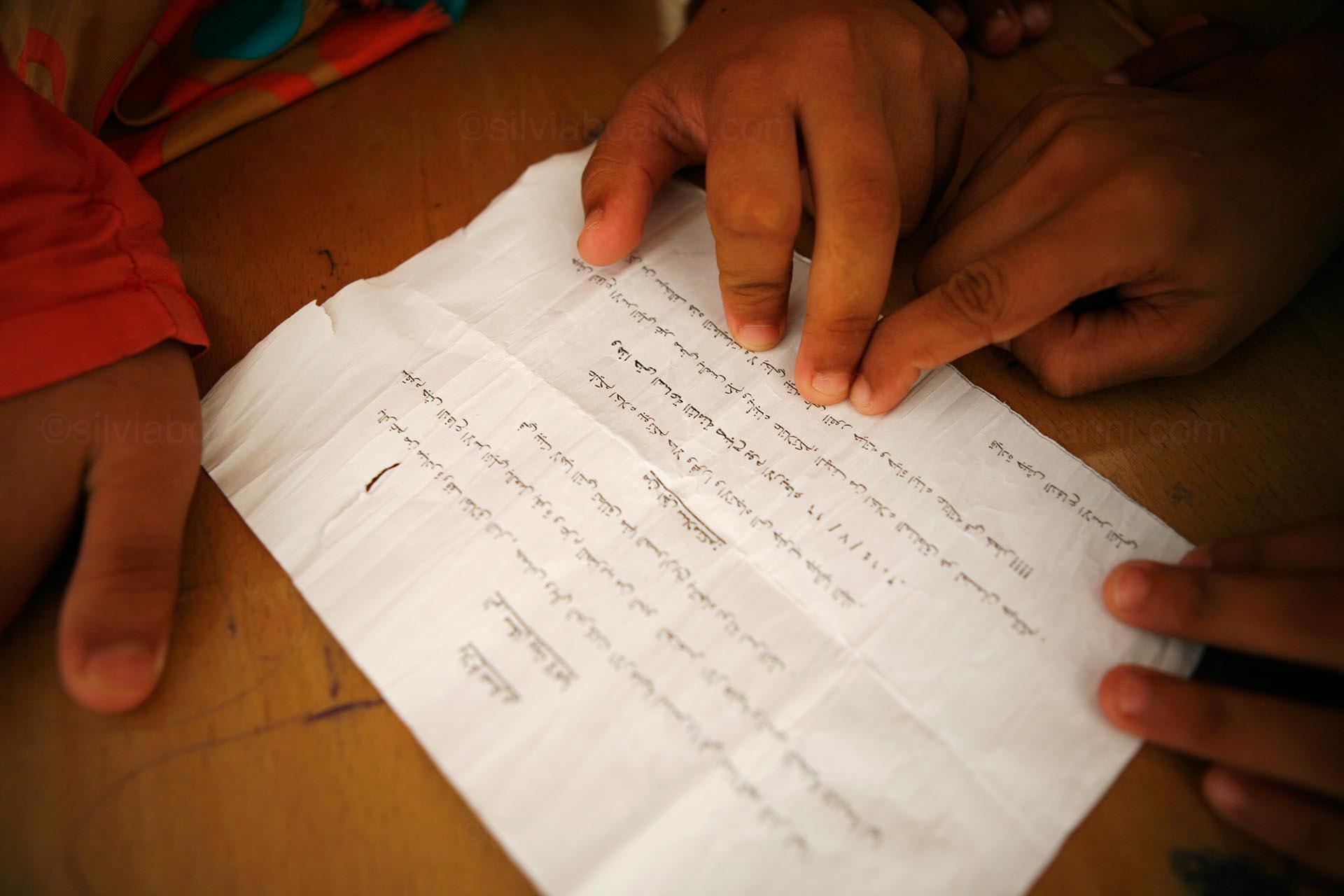 Children from the northern city of Beit Hanoun, now displaced to a UNRWA school in Gaza, read the leaflet that the Israeli air force dropped on their city. The leaflet warns civilians to evacuate the area before an imminent attack. Gaza, July 2014