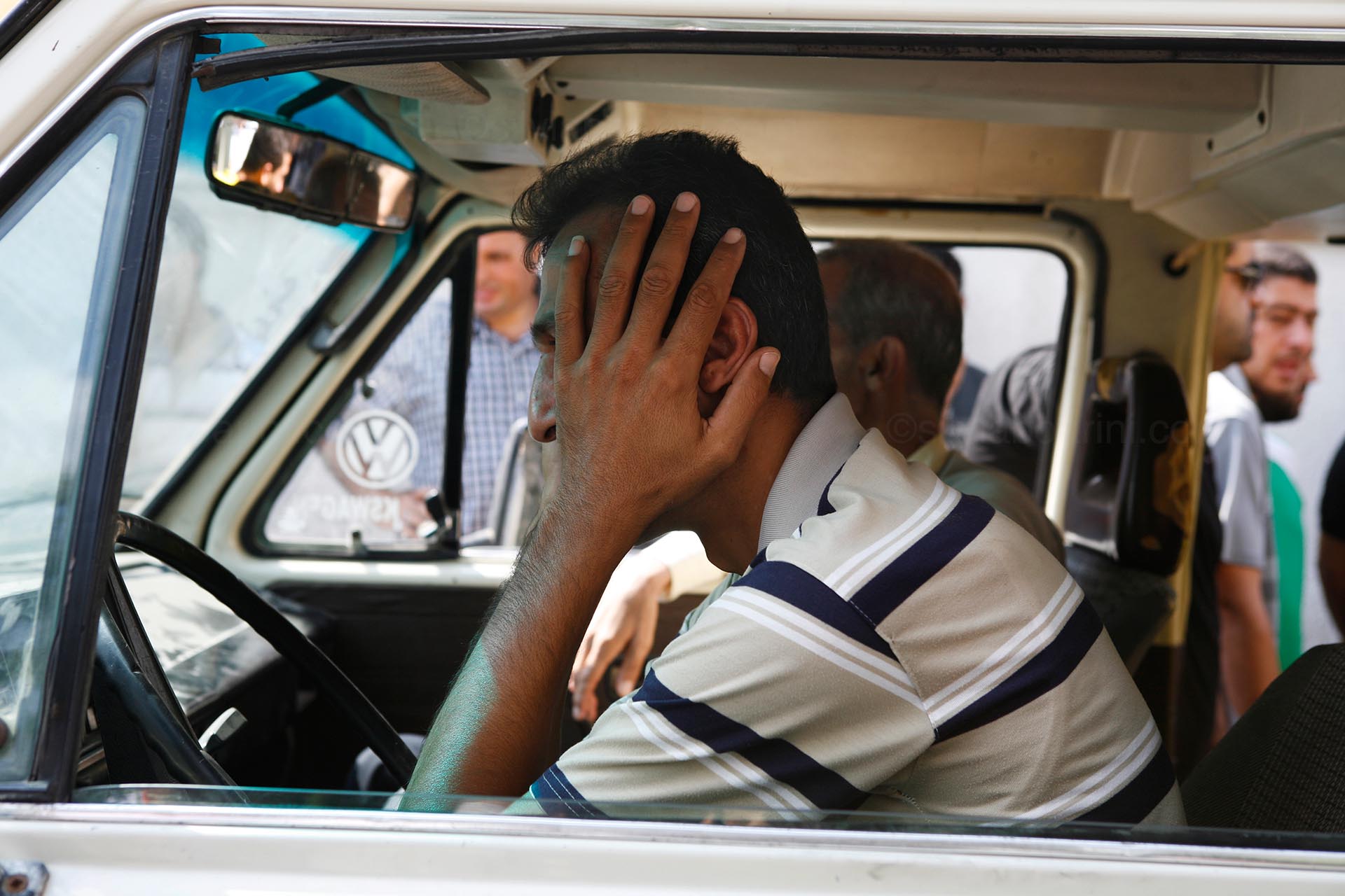 An ambulance driver holds his head in shock outside the morgue on the day Israeli forces began carpet bombing Shujaya. Gaza, 20 July 2014