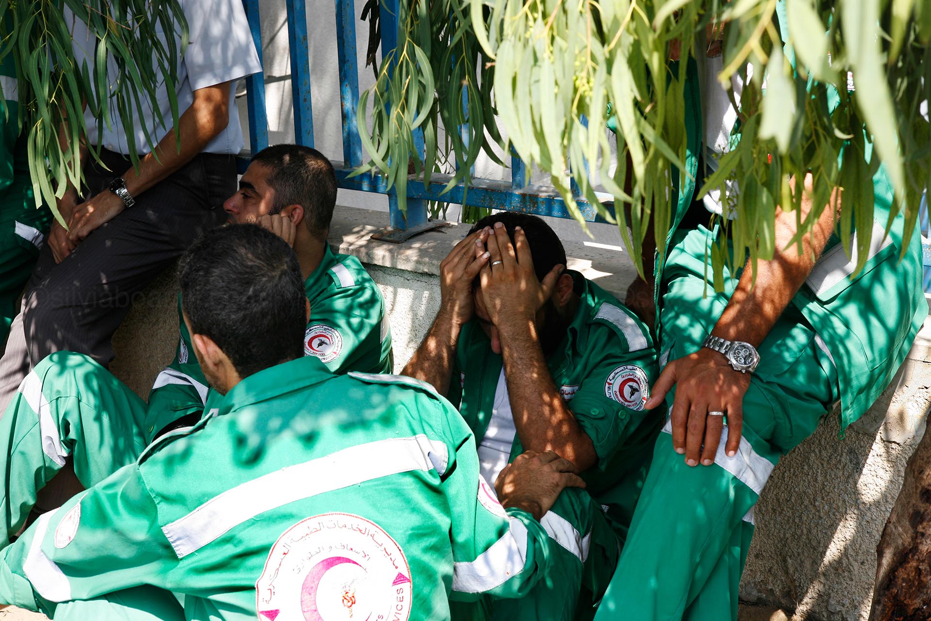 Paramedics sit in shock under a tree outside Shifa hospital after bringing in corpses from Shujayea. Gaza, 20 July 2014