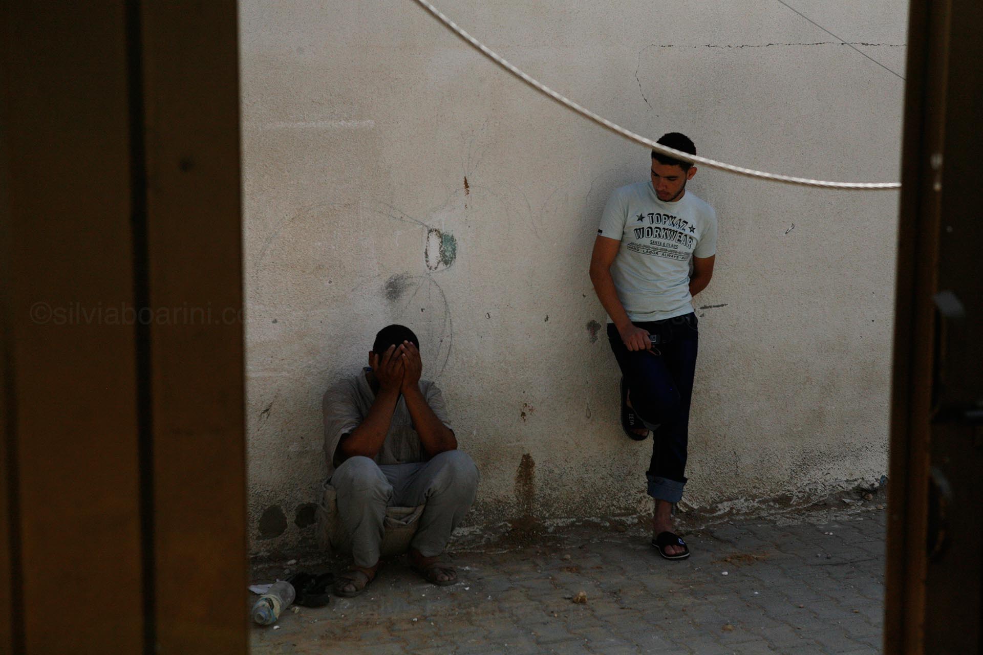 Relatives sit in shock outside Shifa hospital following an explosion at Shati camp, which killed 11 children. Amnesty International attributed the explosion to a misfired Palestinian rocket. Gaza 28 July 2014