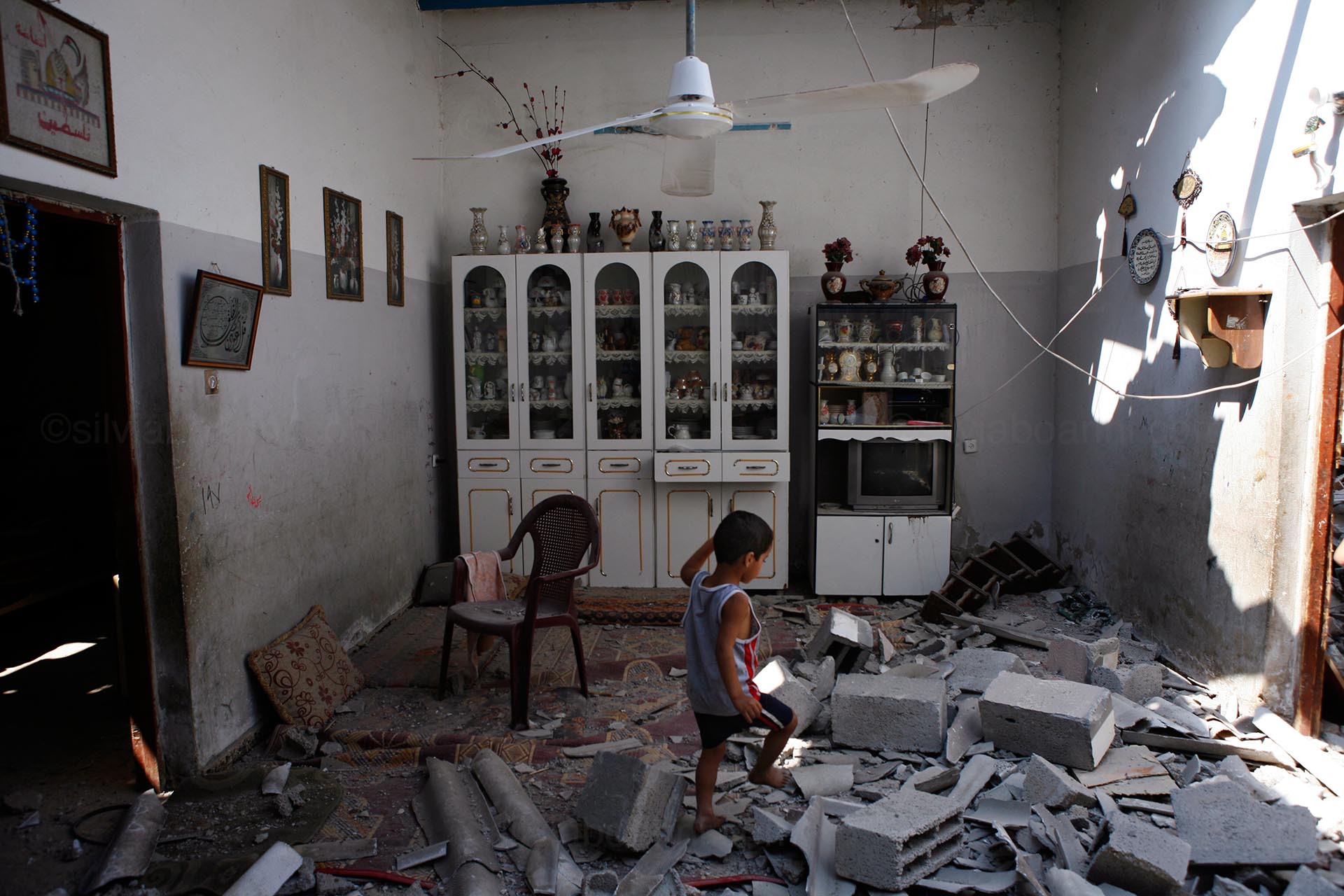 A child of the Abu Bakhr family walks in what used to be living room of his home, which was hit by an Israeli missile. Shati, Gaza, July 2014