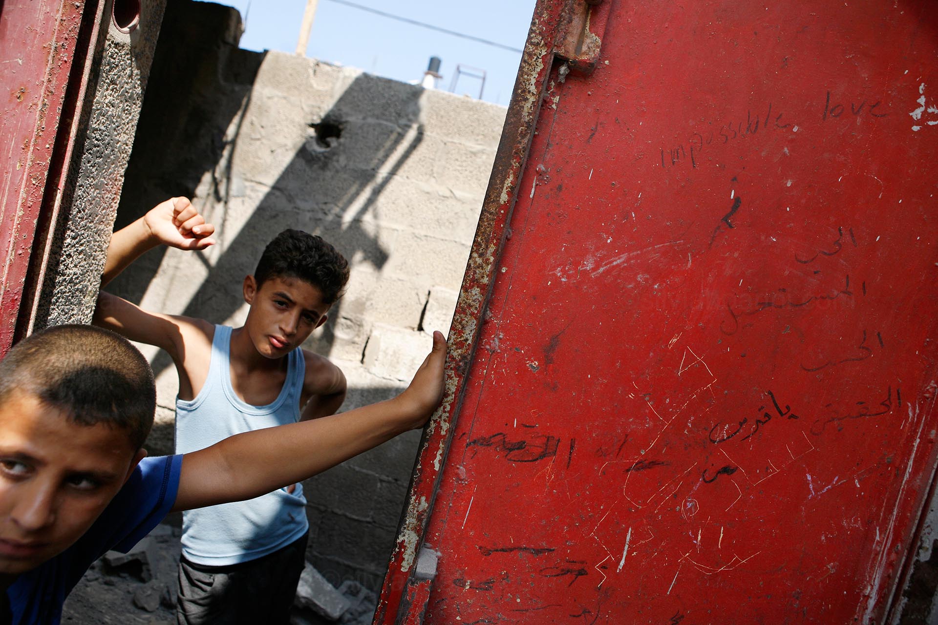 Children stand at the door of the Abu Bakhr home, which was bombed in the night. 'Impossible love' is written on the red metal door. Gaza, July 2014