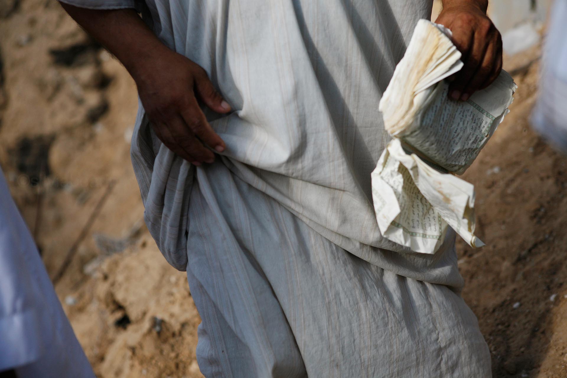 A man picks up pieces of the Holy Koran from the rubble. Abasan Al Kabira, July 2014