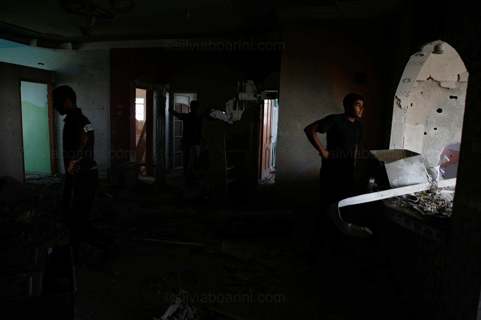 Members of the Abu Bakhr family in their bombed home in Shati. Gaza, July 2014